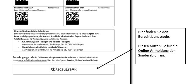 Den Berechtigungscode finden Sie auf den letzten beiden Seiten Ihres aktuellen Gebührenbescheids: